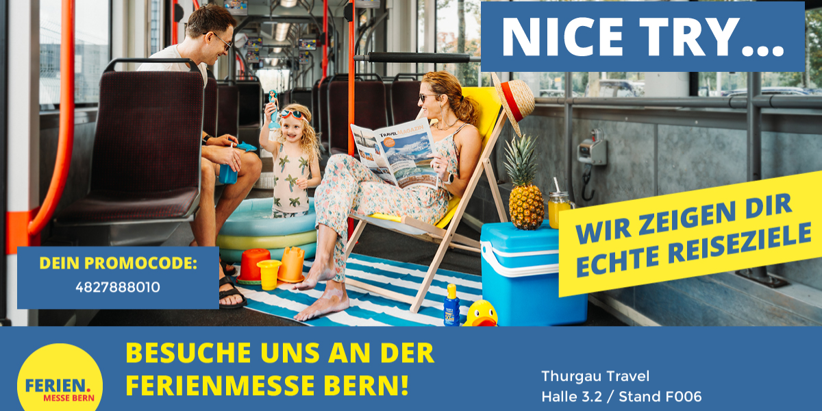 *Angebotskonditionen: Rabatt gilt bei Abreise bis zum 31.12.2026 auf ausgewählte Reisen "by Thurgau Travel" auf das Pauschalarrangement inkl. "Es het solangs het"-Rabatt / Nur gültig bei Neubuchung bis 23.02.2026 / Irrtum vorbehalten / Nur beschränkte Verfügbarkeit / Nicht kumulierbar mit anderen Aktionen, Gutscheinen, Reka-Checks o. Ä. / Keine Barauszahlung / Bei Annullation 100 % Spesen / Nur direkt bei Thurgau Travel buchbar