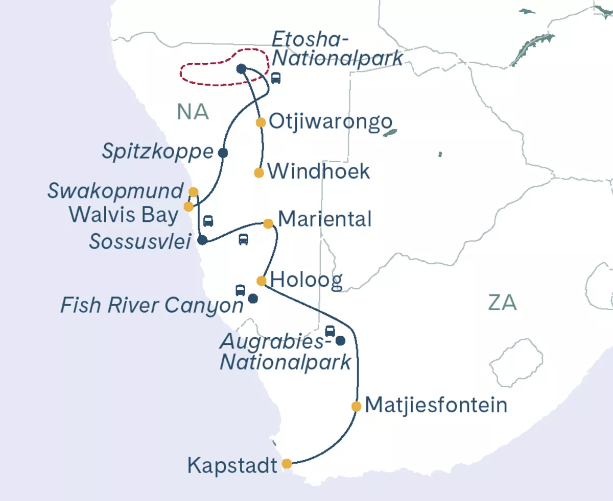 Diese Zugreise führt Sie auf einer einzigartigen Route über 3000 km durch das südliche Afrika: Von Kapstadt, dem schönsten Ende der Welt, fahren Sie auf einer exklusiven Route mit Deutsch sprechender Reiseleitung im African Explorer zu den Naturwundern Namibias. Unendliche Weiten, faszinierende Landschaften, die höchsten Dünen der Welt, wilde Tiere im Etosha-Nationalpark und zahlreiche Spuren deutscher Kolonialgeschichte in Swakopmund und Windhoek warten auf Sie.