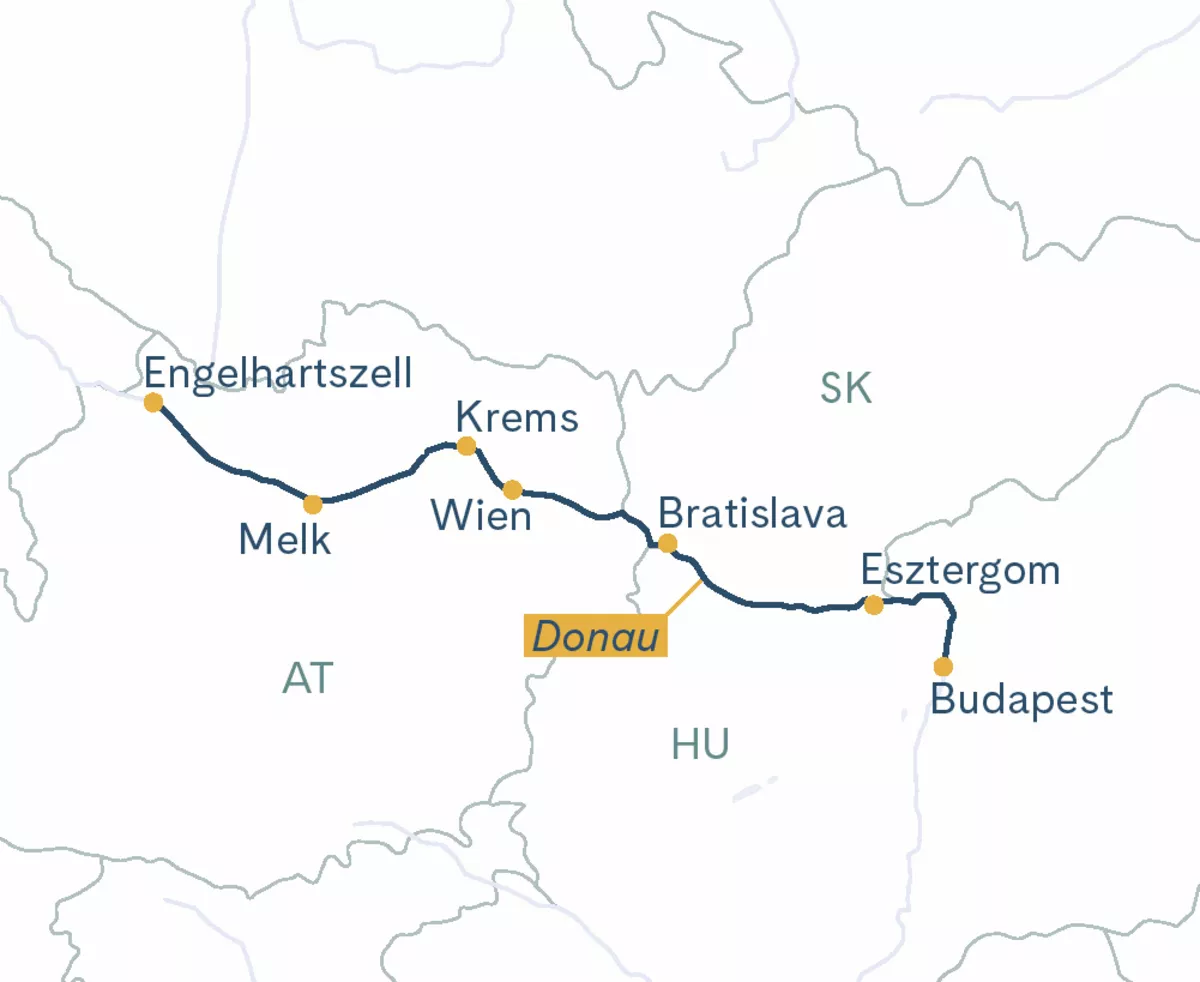 Das beeindruckende Naturschauspiel der Schlögener Donauschlinge, die faszinierende Landschaft der Wachau mit ihren Weinterrassen, die unberührten Auenwälder des Nationalparks Donauauen und das malerische ungarische Donauknie wechseln ab mit pulsierenden Metropolen wie Wien, Bratislava und Budapest. Der breite Strom zieht sich wie ein silberner Faden durch Budapest und teilt die Stadt in das bergige Buda und das flache Pest. Die Barockstadt Vác mit ihren bunten Häusern aus dem 18. Jh. wird Ihnen gefallen. Bratislava, die slowakische Hauptstadt am Fusse der Kleinen Karpaten, lädt mit einer bezaubernden Altstadt zu einem ausgedehnten Bummel ein. Ein kleiner Flirt mit Wien, der Stadt des Walzers gefällig? Ein Feuerwerk an Sehenswürdigkeiten, kleine, verträumte Kaffeehäuser und gemütliche Heurigenlokale erwarten Sie.