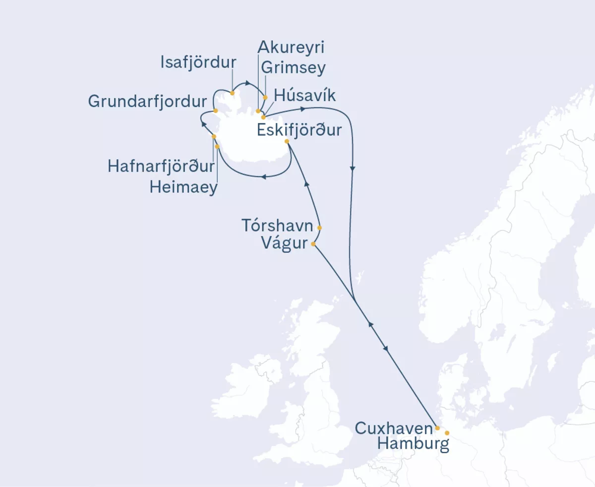 Mit Ihrem Traumschiff MS Deutschland kreuzen Sie gen Norden – zu einer Reise, die Ihnen die Schönheit der Natur in ihrer rauen, eindrücklichen Form näherbringt. Der lange Aufenthalt auf den Färöer Inseln bietet Zeit für stille Momente, spektakuläre Klippen und das Spiel von Licht und Nebel über dem Atlantik. Danach folgt die Umrundung von Island, der sagenumwobenen Insel aus Feuer und Eis – mit gleich acht Stationen, die unterschiedlicher kaum sein könnten. Von den abgelegenen Ostfjorden bei Eskifjördur bis zur lebendigen Hauptstadtregion rund um Hafnarfjördur, dem Tor zu Reykjavik, erleben Sie eine Vielfalt aus Natur, Kultur und nordischer Gelassenheit. Die Westmännerinseln beeindrucken mit vulkanischer Landschaft und Seevogelkolonien, während Grundarfjördur mit dem markanten Kirkjufell-Berg ein beliebtes Fotomotiv bietet. In Isafjördur und Akureyri besuchen Sie charmante Kleinstädte, umgeben von Fjorden und Bergen, die zum Wandern und Staunen einladen. Ein besonderes Erlebnis ist die Überquerung des Polarkreises bei Grimsey – ein symbolträchtiger Moment, der viele berührt. Und in Husavik, der «Walhauptstadt» Islands, haben Sie mit etwas Glück die Gelegenheit, diese majestätischen Tiere in freier Wildbahn zu beobachten. Diese Reise verbindet eindrückliche Naturerlebnisse mit dem Komfort Ihres Schiffes – eine Reise für Entdeckerinnen und Entdecker, die das Besondere suchen.