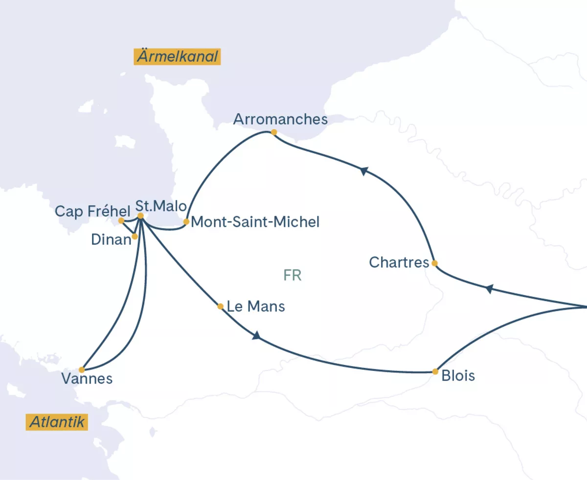 Die Normandie ist wie ein Gemälde: grüne Weiden, goldgelbe Sandstrände und Gaumenfreuden wie Calvados, Cidre und Camembert. In der Bretagne staunen Sie am tosenden Atlantik über die Urgewalten der Natur. Es sind Bilder einer Landschaft von bizarren Felsformationen, wilden Küsten und reichen Traditionen. Trutzige Steinburgen und bunte Fachwerkhäuser geben ein reizvolles und malerisches historisches Kolorit.