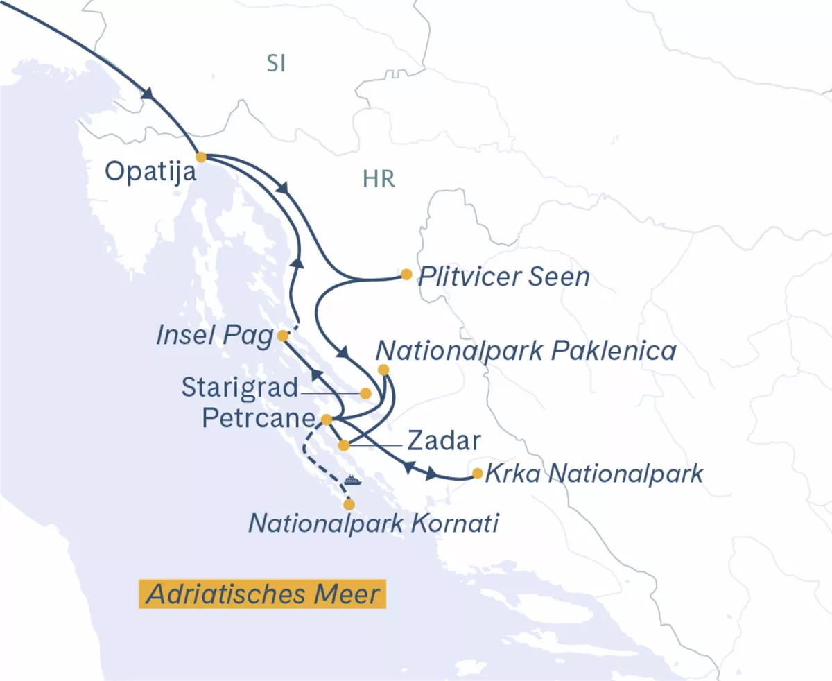 Fahrt zum Nationalpark Plitvicer Seen. Die Seenplatte besteht aus 16 übereinander liegenden Seen, die durch Wasserfälle und Kaskaden miteinander verbunden sind. Sie erkunden den Nationalpark zu Fuss, per Boot und Panoramafahrzeug. Weiterreise an die Adria nach Petrcane.