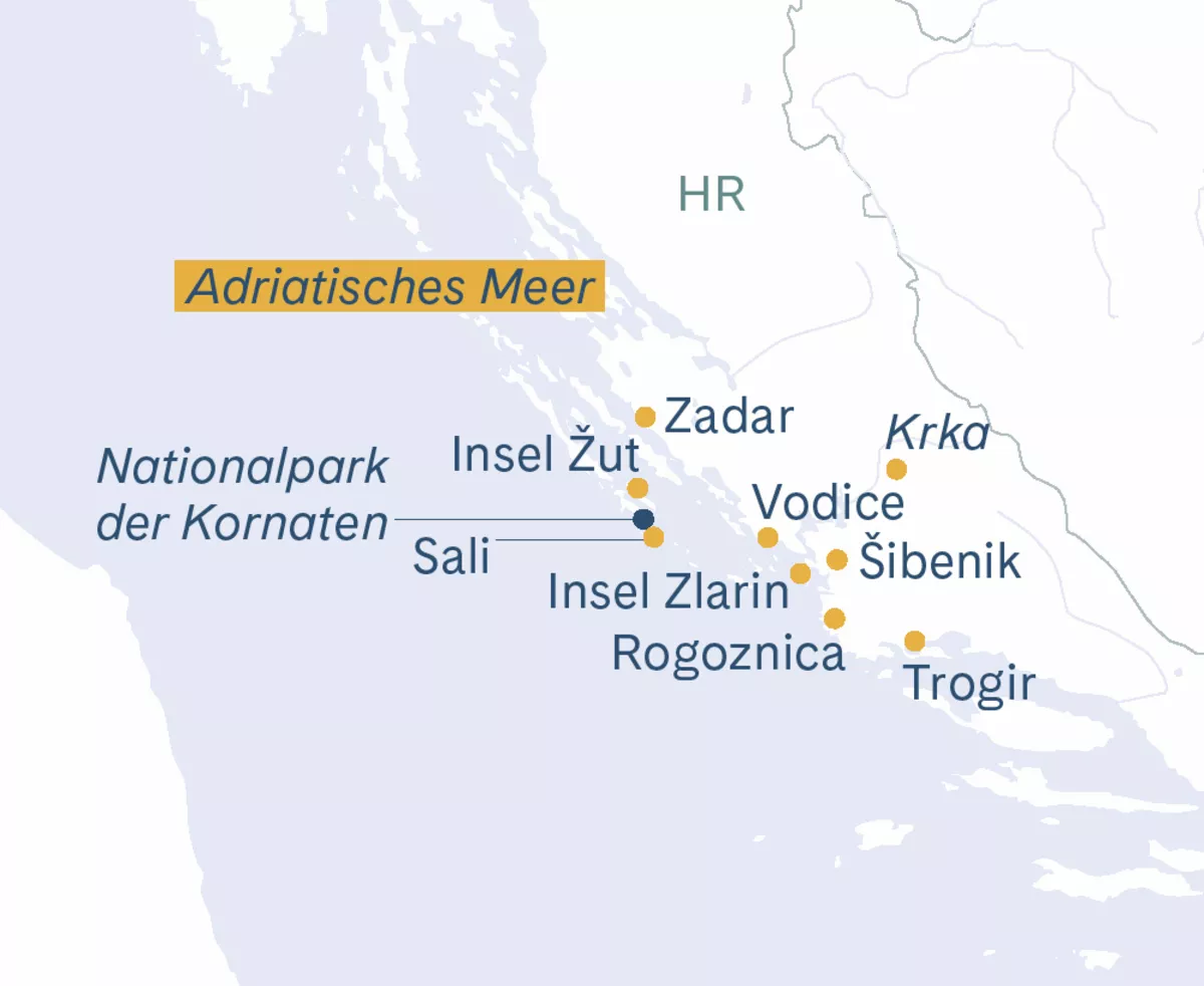 Kreuzen im Archipel des Nationalparks der Kornaten. Falls das Wetter sowie die Strömung es zulassen, bietet sich die Gelegenheit zum Baden im herrlich türkisklaren Wasser. In Sali haben Sie Zeit für eigene Entdeckungen.