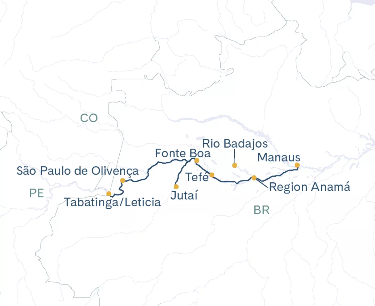 Entdeckung per Boot in den Seitenarmen rund um Jutaí. Spaziergang durch das Städtchen mit Kennenlernen der Lebensweise der Einheimischen Caboclos. Rückkehr an Bord und Fahrt durch dünn besiedelte Amazonas-Regionen begleitet von den Flussdelfinen. Vortrag über die Tikunas, das bedeutendste indigene Volk des Bundesstaates Amazonas.