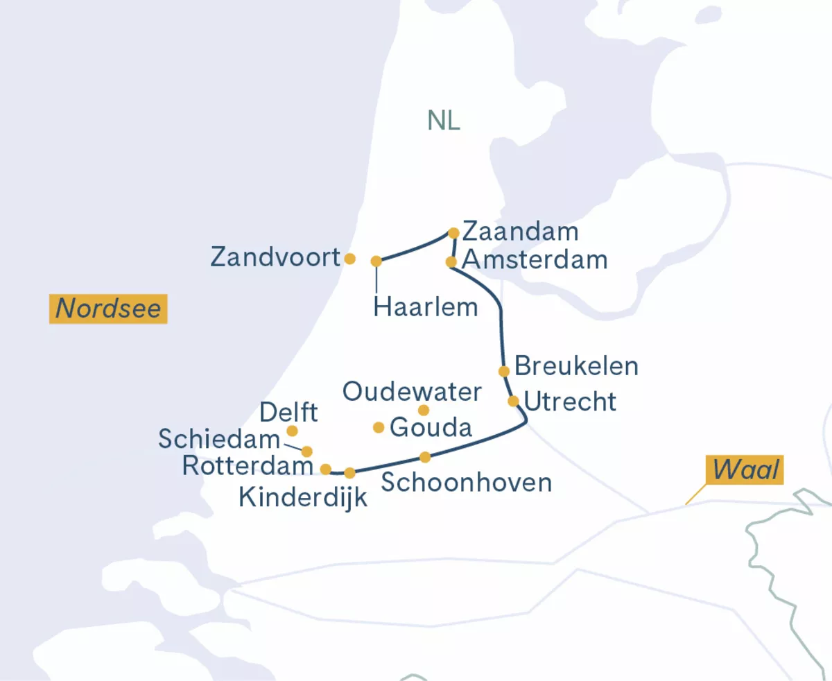 Sportliche Gäste radeln zunächst nach Alblasserdam. Wer es gemütlicher mag, kann dafür den Wasserbus nehmen, der dafür ca. 40 Minuten braucht. Von hier aus sind es nur wenige Minuten mit dem Velo nach Kinderdijk, der berühmten, aus 19 Exemplaren bestehenden Windmühlenreihe und UNESCO-Weltkulturerbe. Danach können Sie zwischen einer längeren Tour mit Besuch der schönen Käsestadt Gouda oder einer kürzeren Route über den Polder Alblasserwaard wählen. Ziel beider Touren ist die Silberstadt Schoonhoven, in welcher Sie einen Silberschmied besuchen können. Hinweis: Sollte das Anlegen in Schoonhoven nicht möglich sein, legt das Schiff stattdessen in Gouda an.