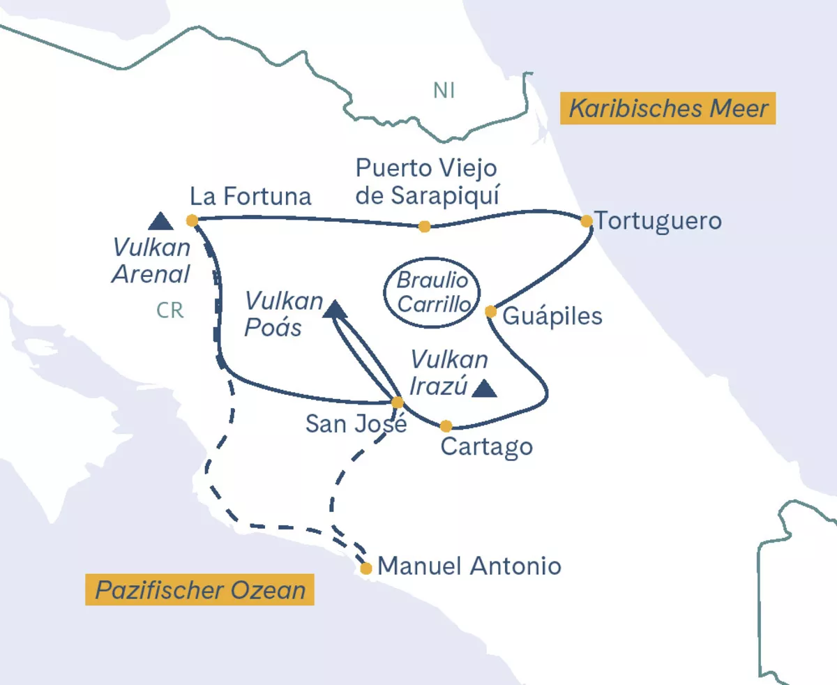 Costa Rica ist das wohl schönste und sicherste Land Mittelamerikas. Üppige Vegetation, paradiesisch anmutende Pflanzen- und Tierwelt, imposante, mit Vulkanen versetzte Gebirgsketten und der tiefblaue Pazifik sind Erlebnisse der besonderen Art. Den Einwohnern des demokratisch geführten und von der Landwirtschaft geprägten Costa Ricas geht es wirtschaftlich und sozial gut. Sie sind zuvorkommend und gastfreundlich, was die Reise zusätzlich attraktiv macht. Wir freuen uns, Sie auf unserer Pionierreise ins mittelamerikanische Paradies dabei zu haben.