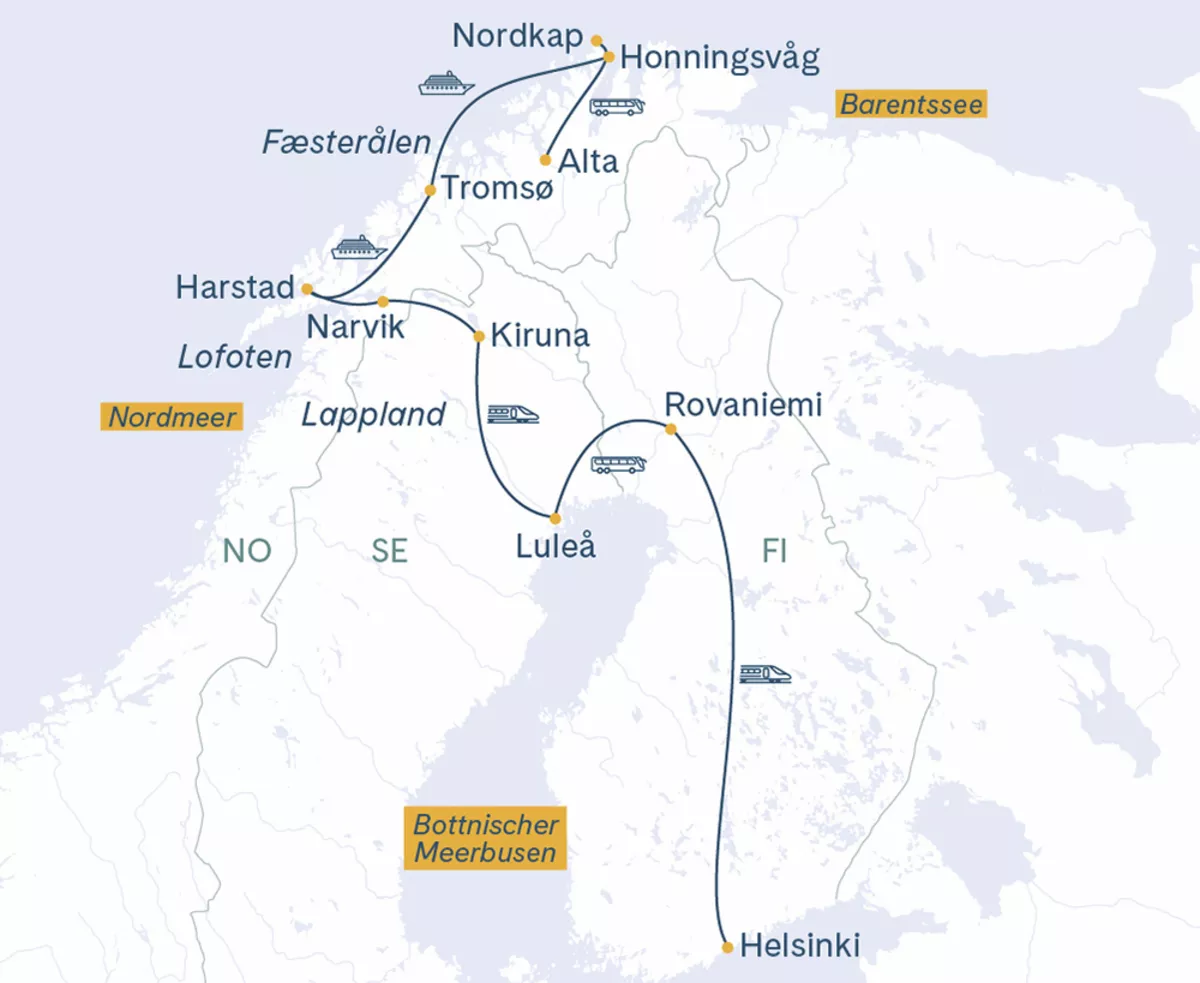 Zugfahrt auf der Erzbahnstrecke weiter nach Norden vorbei an Fichten- und Birkenwäldern, welche sich in menschenleere Tundra verändern. Ab Narvik Weiterfahrt per Bus ins norwegische Harstad.