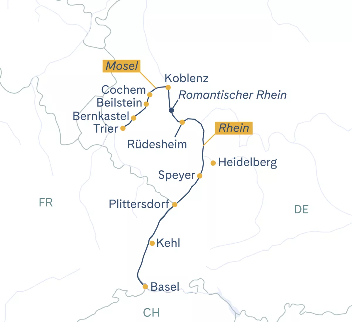 Individuelle Anreise nach Basel. Einschiffung und Kabinenbezug ab 14:00 Uhr. Um 15:00 Uhr heisst es «Leinen los!».