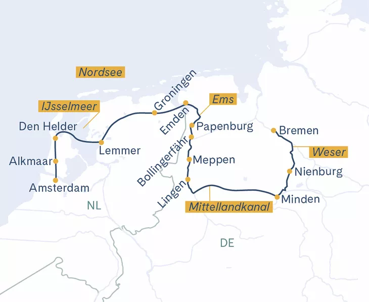 Begeben Sie sich auf eine abwechslungsreiche Schifffahrt von den Grachten Amsterdams bis nach Bremen. Start ist in Amsterdam, bekannt für historische Häuser und Brücken. Über Alkmaar mit seinem Käsemuseum führt die Route durch Nordholland nach Den Helder. Entlang des Nordhollandkanals und über das IJsselmeer erreichen Sie Texel mit seinen Dünen und Dörfern. Weiter geht es durch das Emsland, über die Ems und den Dortmund-Ems-Kanal nach Papenburg, wo die Meyer-Werft besichtigt wird. In Lingen erleben Sie Geschichte beim Kivelinge-Rundgang. Über den Mittellandkanal gelangen Sie nach Minden, Nienburg und schliesslich Bremen, mit seinem Rathaus, Roland und dem „Haus des Glockenspiels“ aus Meissner Porzellan.