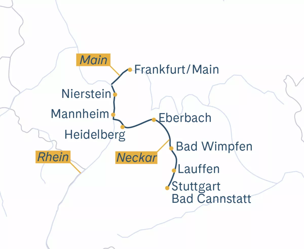 370 km misst der Neckar-Radweg von der Quadratestadt Mannheim bis zum Ursprung im Schwenninger Moos. Den schiffbaren Teil des Flusses können Sie bei dieser Reise erleben und Ihr schwimmendes Hotel ist immer mit dabei! Nach dem Start der Reise in "Mainhattan", wie Frankfurt am Main auch genannt wird, erleben Sie schon bald einen steten Wechsel von Natur und Kultur, von Vergangenheit und Moderne mit lauschigen Orten und lebendigen Grossstädten. Weite Auen und enge Täler, Weinberge, Burgen, Schlösser und historische Stadtkerne erwarten Sie auf dem Velo quer durch Südhessen und Baden-Württemberg.