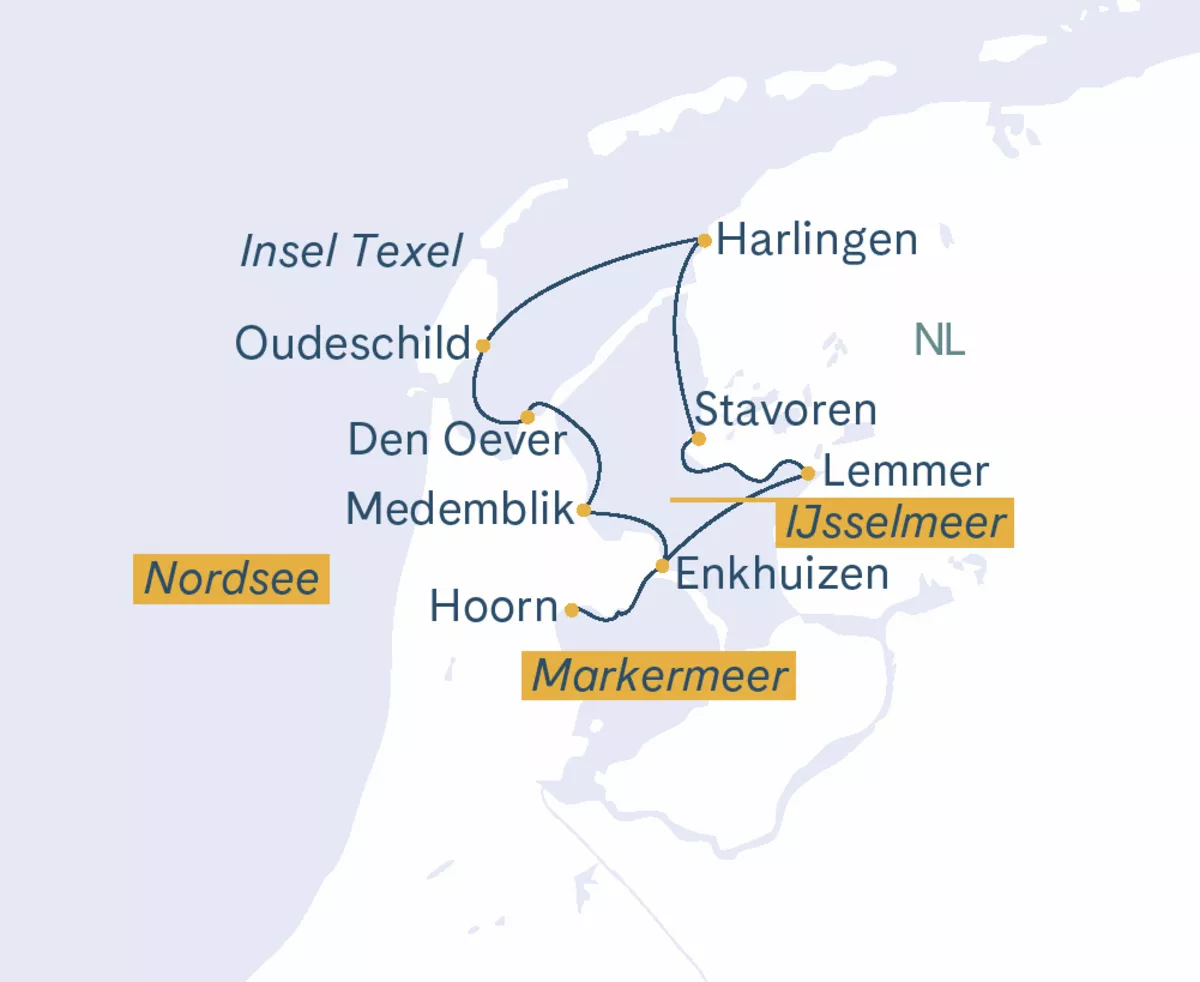 Den Tag beginnen Sie mit einer Schifffahrt übers IJsselmeer in die Provinz Friesland nach Lemmer mit seiner historischen Altstadt und hübschen Giebelhäusern. Die Velotour führt von dort über Osterzee Buren ans Tjeukermeer und via Munnekeburen - Scherpenzeel und Schoterzijl zurück nach Lemmer. Eine längere Tour führt zusätzlich rund um das Naturschutzgebiet Rottige Meenthe und Brandemeer. Tipp: Besuchen Sie das grösste, noch in Betrieb befindliche Dampfschöpfwerk der Welt in Woudagemaal.