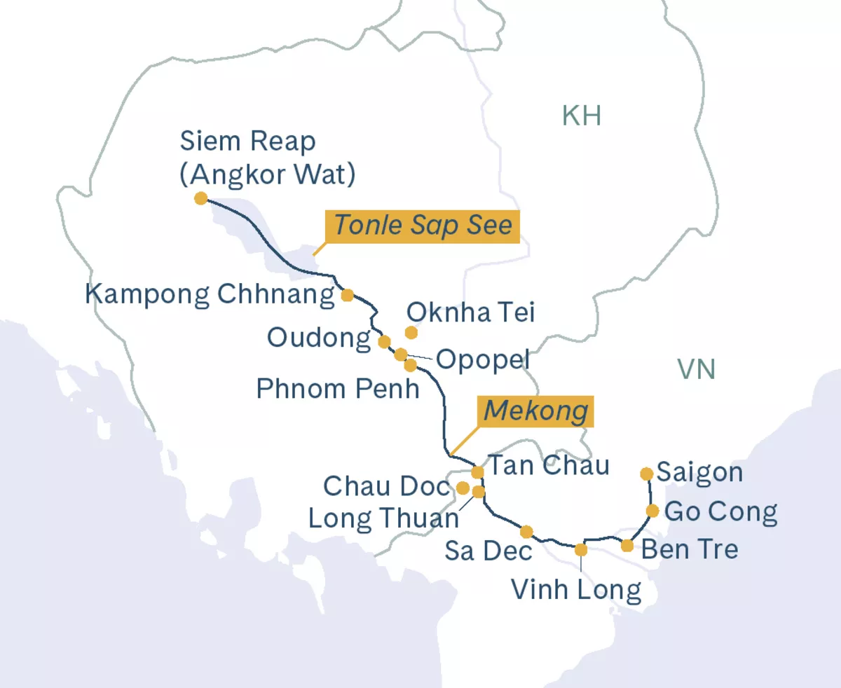 Indochina – ein Begriff, der Sehnsüchte weckt. Entdecken Sie diese faszinierende Region mit ihren verborgenen Schätzen und spektakulären Landschaften in Vietnam und Kambodscha: das üppige Mekong-Delta mit seinen unzähligen Flüssen und Kanälen sowie Kambodscha mit dem beeindruckenden Tempelkomplex von Angkor Wat. Die Ausflüge zu historischen Stätten, der reiche kulturelle Hintergrund und die herzliche Gastfreundschaft der Menschen, denen Sie auf Ihrer Reise begegnen, machen diese Flusskreuzfahrt entlang des südlichen Mekongs zu einem einzigartigen Erlebnis. Besonders bemerkenswert ist, dass die RV Mekong Discovery als einziges Flussschiff direkt im historischen Zentrum von Saigon anlegen kann.