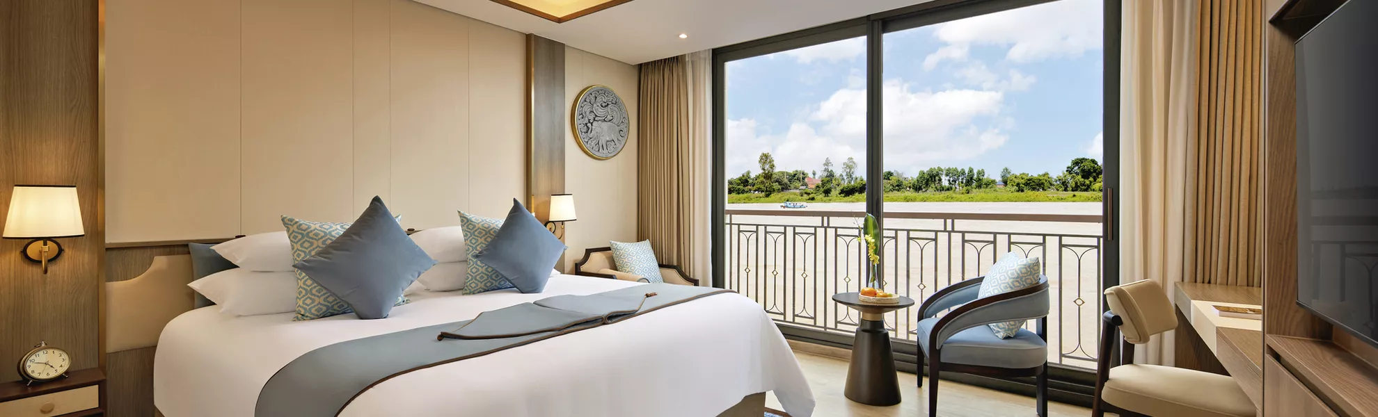 Das im Jahr 2024 neu gebaute Boutique-Luxusschiff bietet in 19 Suiten Platz für 37 Gäste. Alle Suiten liegen aussen und verfügen über einen französischen Balkon resp. in den Grande Suiten über einen Privatbalkon, welcher einen unvergesslichen Blick auf die vorbeiziehende Uferlandschaft entlang des Mekongs bietet.
