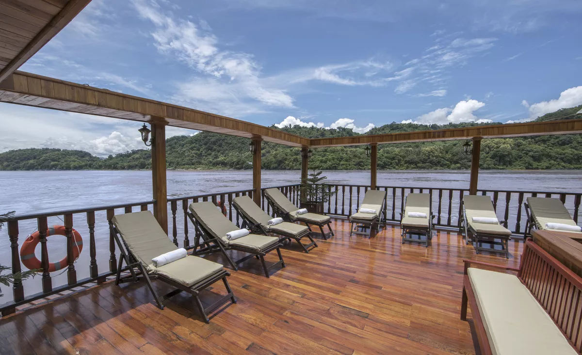 Das Oberdeck bietet ein Indoor-Restaurant, einen Barbereich und eine separate Sonnenterrasse mit einem versenkbaren Dach. Frühstück und Mittagessen werden im Bordrestaurant als Buffet angerichtet. Das Abendessen wird am Tisch serviert. Das Speisenangebot setzt sich aus südostasiatischen und europäischen Köstlichkeiten zusammen. Entdecken Sie Land und Leute und tauchen Sie ein in die traditionelle asiatische Gastfreundschaft. Der bewährte Deutsch sprechende Kreuzfahrtdirektor führt die Gäste auf Ausflügen abseits bekannter Reisewege auf wahre Pionier- und Expeditionspfade.