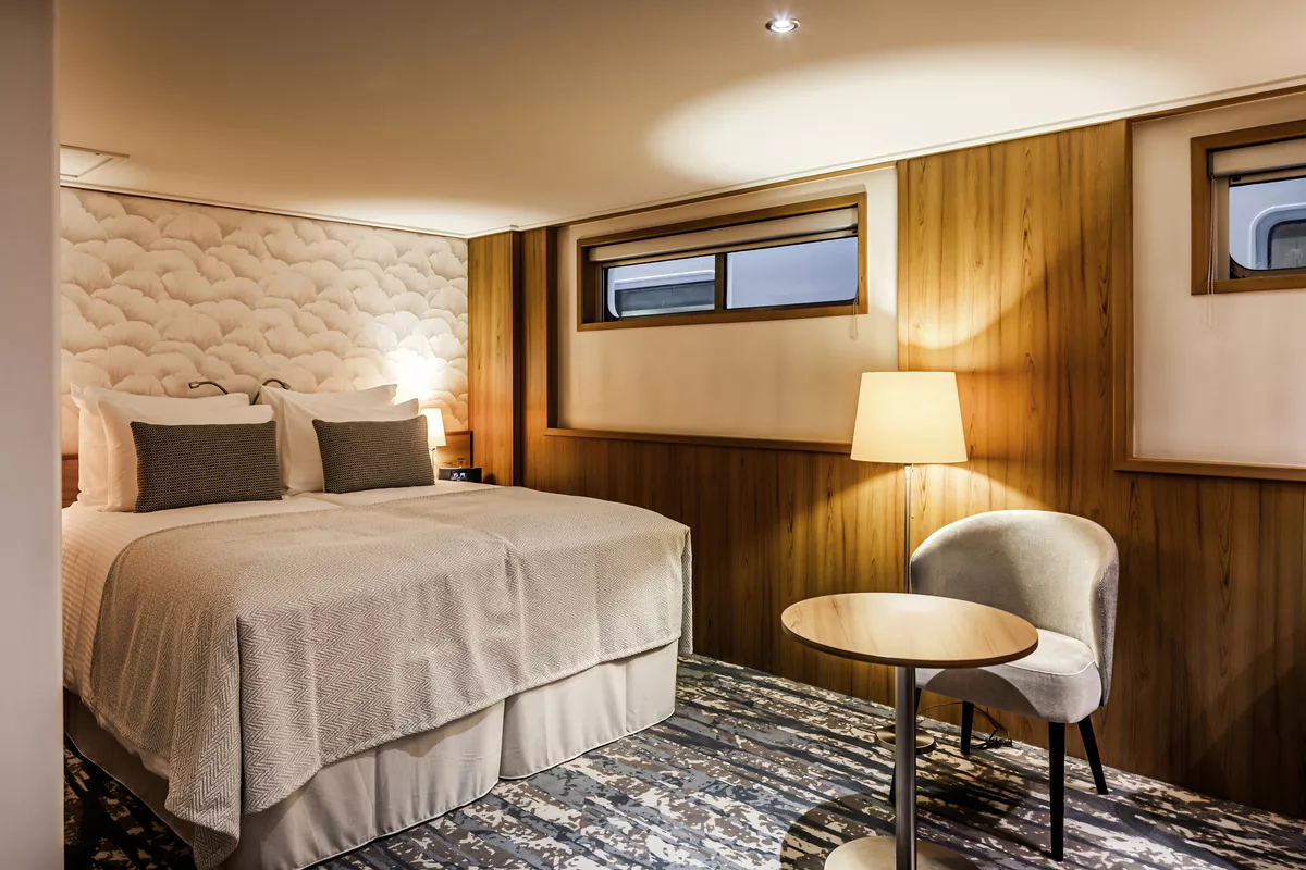 Alle 2-Bettkabinen (ca. 16 m²), 1-Bettkabinen (ca. 11 m²), Suiten (ca. 24 m²) und die Master Suite (ca. 32 m²) liegen aussen, sind komfortabel und stilvoll eingerichtet. Auf dem Mittel- und Oberdeck mit französischem Balkon, auf dem Hauptdeck sind die kleineren Fenster aus Sicherheitsgründen nicht zu öffnen. Alle Kabinen sind mit Dusche/WC, Föhn, Kühlschrank, Nespressomaschine, Safe, TV/Radio und individuell regulierbarer Klimaanlage ausgestattet. Die Suiten verfügen über ein zusätzliches Sofa und eine Badewanne anstelle der Dusche. Die Master Suite ist mit einem zusätzlichen Sofa und separater Badewanne ausgestattet.